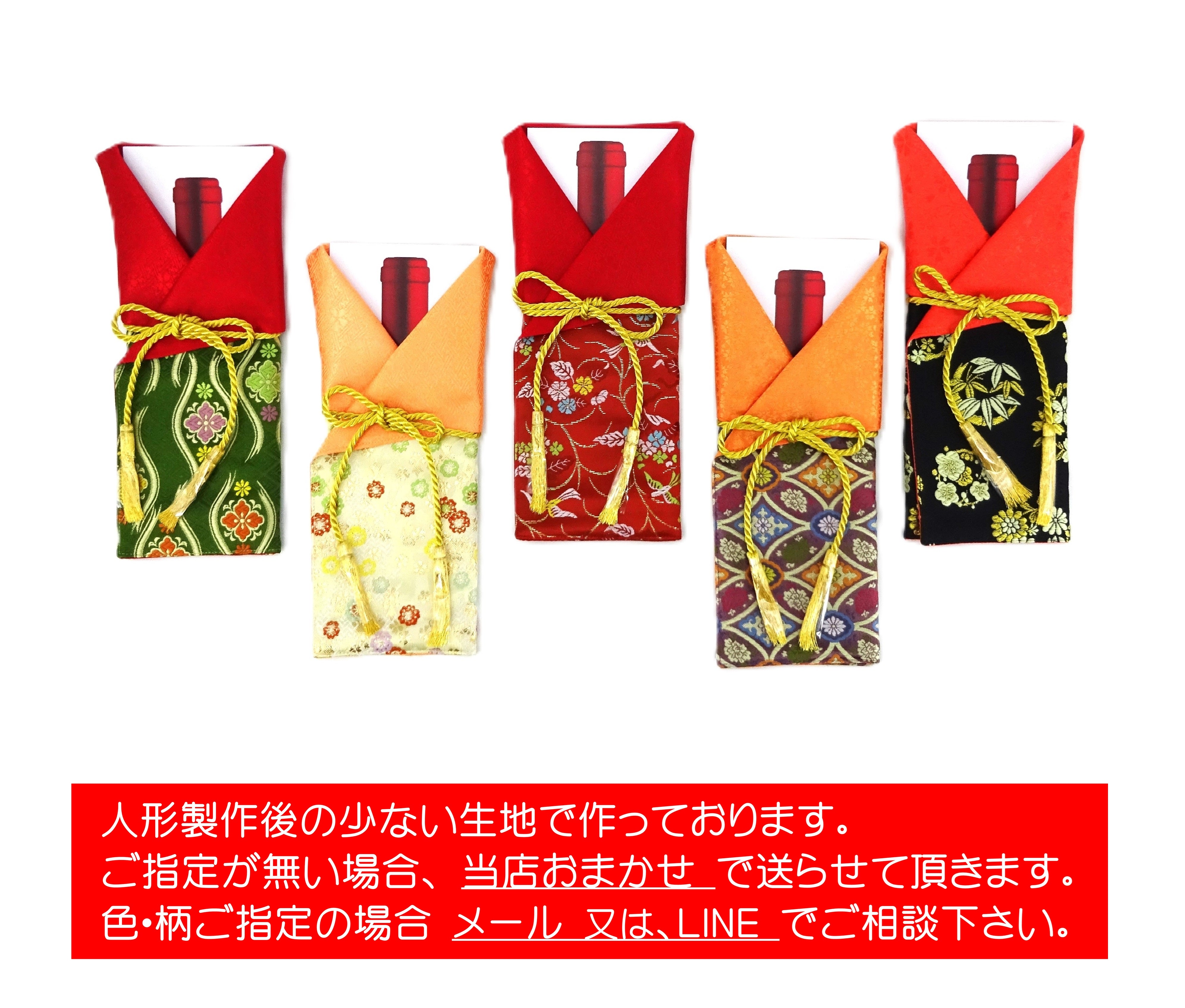 ワインボトル、焼酎、日本酒などに着物のように着付けられアレンジを楽しんでください。