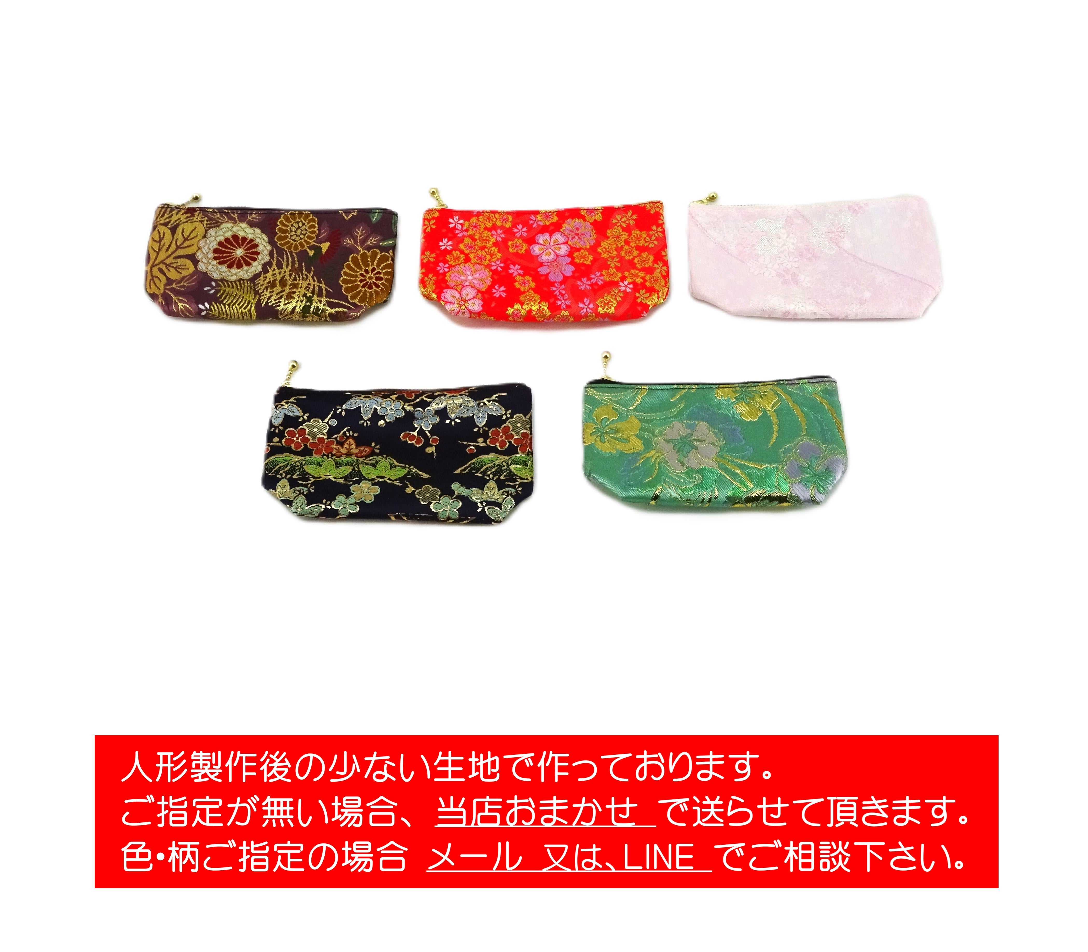 ※1)人形の作製後の少ない生地で作っております。ほぼ同じ色・柄などはありませんので、ご希望があれば当店のメール・LINEにてご相談下さい。