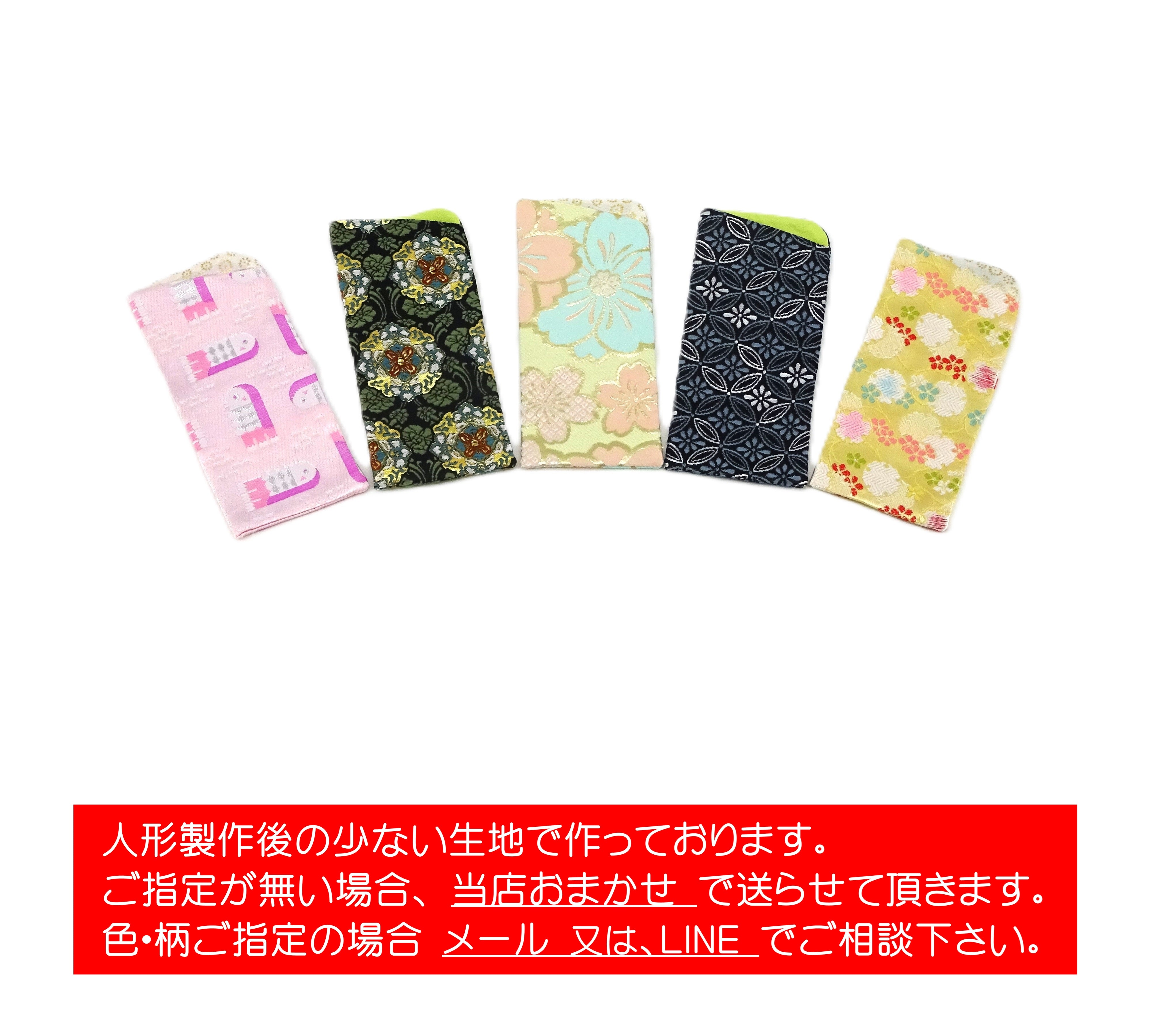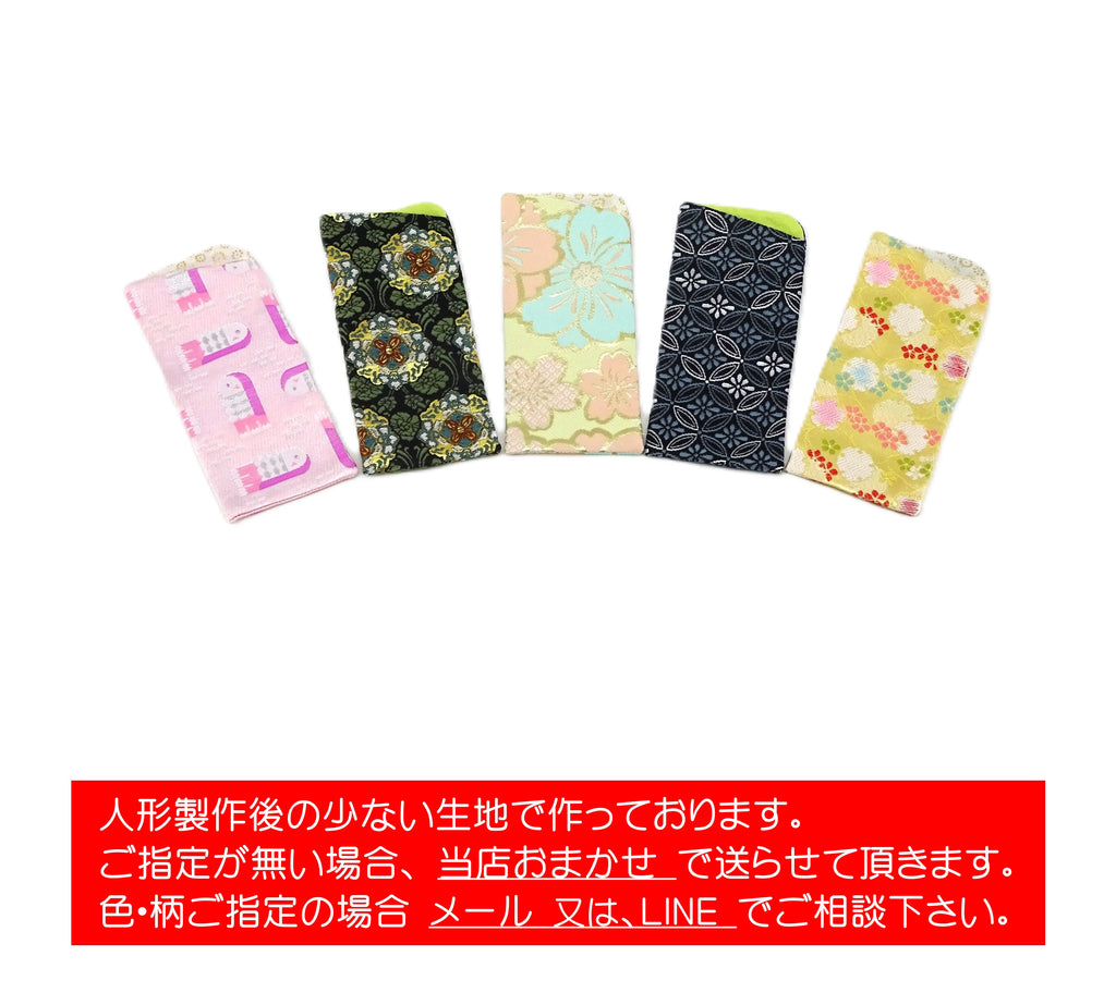 ※1)人形の作製後の少ない生地で作っております。ほぼ同じ色・柄などはありませんので、当店の電話・メール・LINEにてご相談下さい。