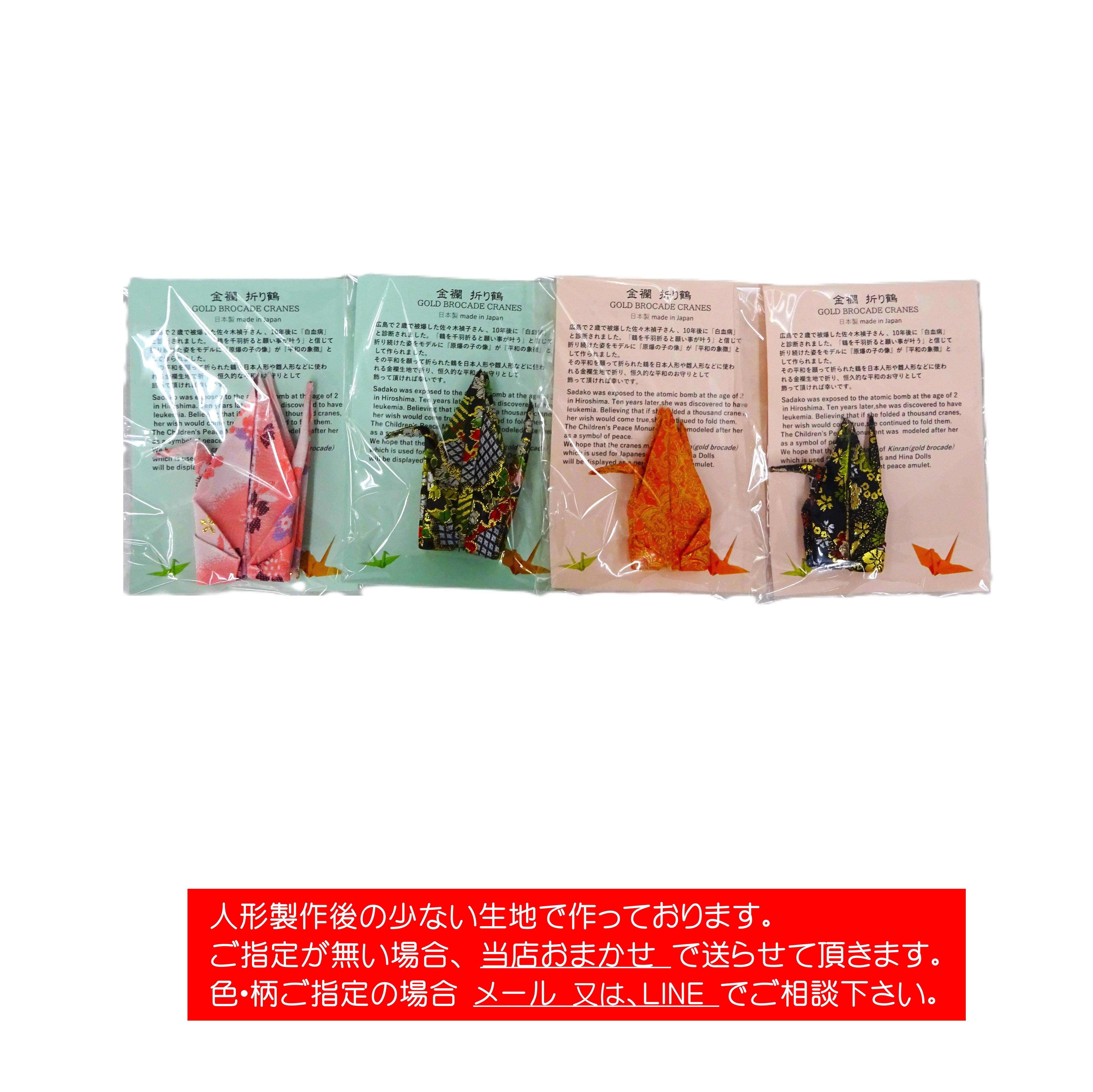 広島で2歳で被爆した佐々木禎子さん 、10年後に「白血病」と診断されました。「鶴を千羽折ると願い事が叶う」と信じて折り続けた姿をモデルに『原爆の子の像』が『平和の象徴』として作られました。その平和を願って折られた鶴を日本人形や雛人形などに使われる金襴生地で折り、恒久的な平和のお守りとして飾って頂ければ幸いです。